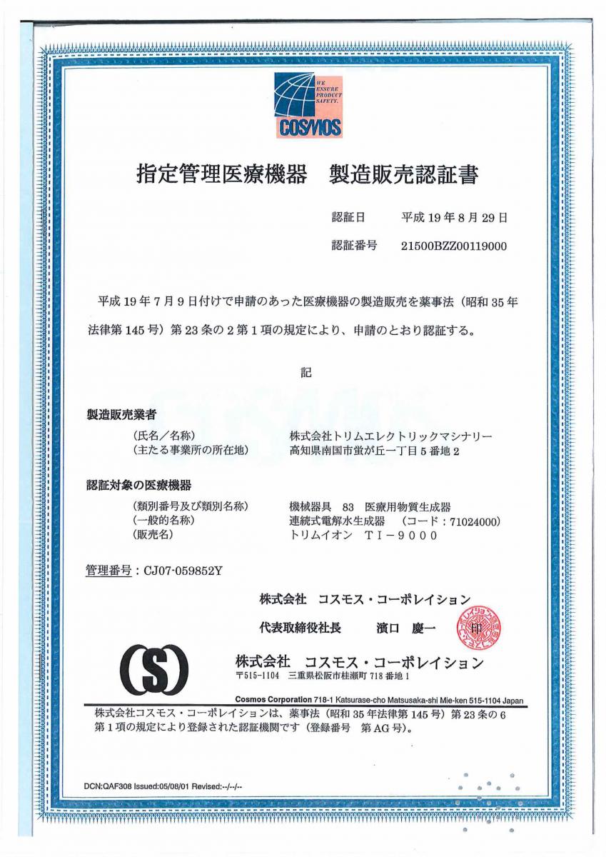 Được Bộ Y tế Nhật Bản công nhận là thiết bị Y tế gia đình Nhật Bản, đạt chuẩn ISO 9001 về quản lý chất lượng và ISO 13485 về lĩnh vực sản xuất thiết bị y tế. Số chứng nhận sản xuất và kinh doanh thiết bị y tế: 21500BZZ00119000